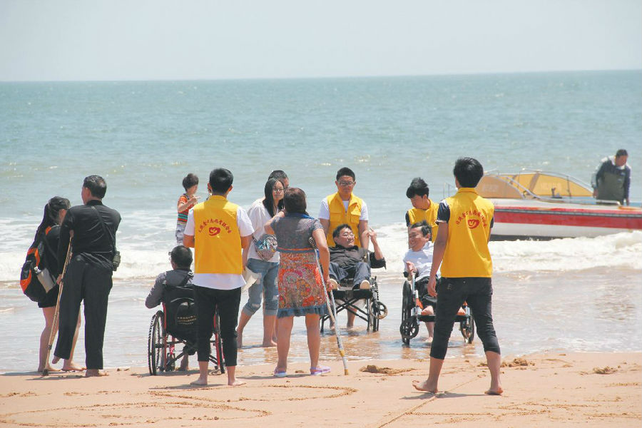 到了海边,有十几级台阶,还有很宽的沙滩,沙子又松软,我们觉得根本没办法下去。可是滕会长等志愿者说,你们来一次不容易,不管再累也把你们拉到海边、摸到海水。很快,他们三五个人一齐把十几辆轮椅连人一起抬下来。走在沙滩上,涨潮的海水打过来,他们干脆把鞋子都脱了,光着脚抬着我们进到海里。