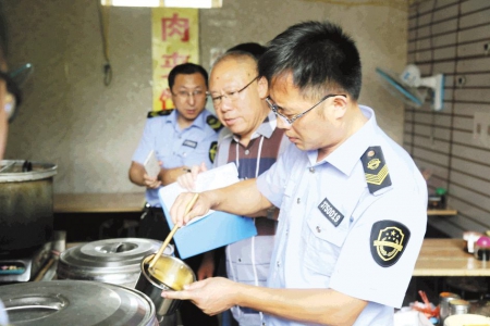 7月18日,市食品药品监督管理局联合市迎接国家卫生城市复审指挥部办公室,针对学校及车站周边小饭店、大型超市、农贸市场等前期检查问题较为突出的重点区域进行随机抽查,主要对经营业户亮证经营、落实“三防”措施、后厨卫生、消毒设施等卫生城市复审工作落实情况,并对存在的问题现场督促整改。图为执法人员对学校周边小饭店进行检查。 (本报记者 丁昱铭 摄)