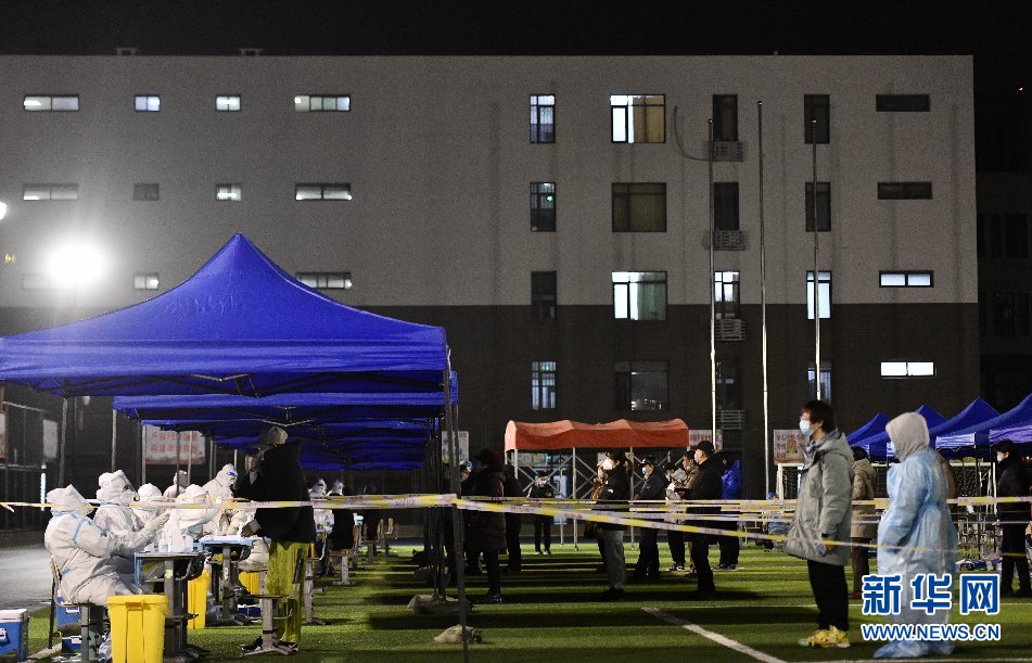 1月9日晚,天津市南开区鼓楼街道中营小学核酸检测点正在检测。新华社记者 赵子硕 摄