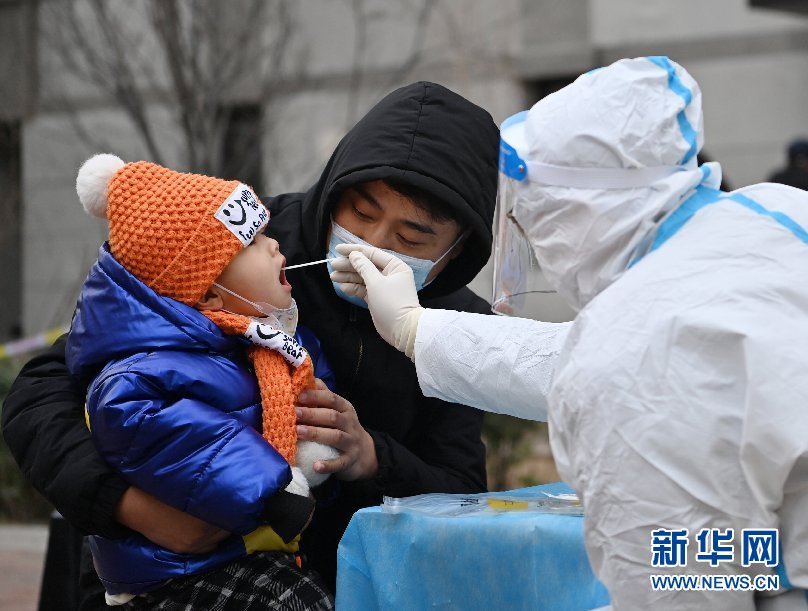 1月9日,在天津市西青区中北镇锦曦花苑社区一处核酸检测点,家长抱着孩子进行核酸检测。 新华社记者 李然 摄