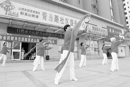 10月22日,青岛路社区的居民在用新发放的体育器材进行体育运动展演。 当日,日照市全民健身志愿服务进社区活动来到山海天旅游度假区青岛路社区。向社区居民捐赠了腰鼓、扇子等体育健身器材。今年,我市全民健身志愿服务进基 层活动已惠及全市60余个社区,捐赠体育健身器材1500余件,将科学健身理念、健身方法、健身器材和健身科技送到了老百姓身边,让市民在家门口就能够接 受到体育健身指导服务。(记者 赵怡凯 摄)