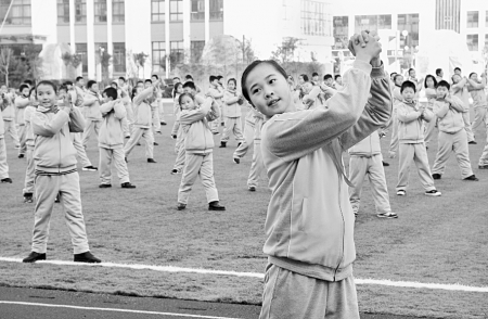 12月4日,浮来春小学的小学生正在进行广播体操会操比赛。12月2日至4日,东港区教育局举办全区“2015年第三套中小学生广播体操会操比赛”,全区36所中小学校