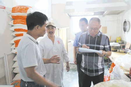 近日,市食品药品监督管理局联合市迎接国家卫生城市复审指挥部办公室,对全市农贸市场中的食品加工、食品经营等场所进行随机检查,主要对经营业户亮证经营、落实“三防”措施、后厨卫生、消毒设施等卫生城市复审工作落实情况及发现的问题现场督促整改。图为执法人员对沙墩市场食品加工商户进行检查。 (本报记者 丁昱茗 摄)