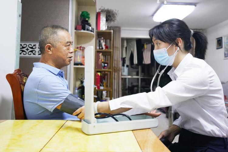 △河北承德高新区滨河社区居家养老服务中心工作人员给社区老年居民量血压。