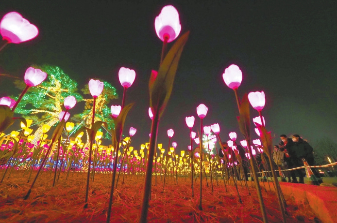 2月5日,市民在市人民广场的花灯前“打卡”。
