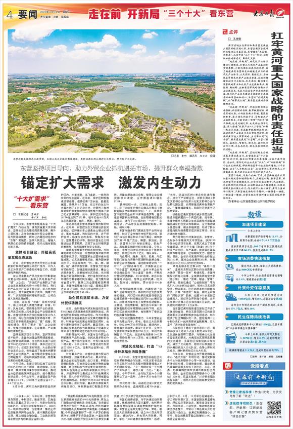 今年以来,东营市积极落实省“十大扩需求”行动计划,谋划实施重大项目建设,坚持生态优先推动高质量发展,提升人居环境;及时有效解决外贸企业困难,促外贸保稳提质,同时让内需拉动经济的“引擎”更强劲;坚持人民至上,增强人民群众的获得感幸福感,现代化强市面貌日新月异。