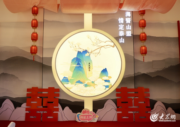 缘结同心红门里,泰山见证拜高堂。泰山区民政局婚姻登记处红门巡回点外观为传统古建筑,走进巡回点,入目便是“海誓山盟 情定泰山”的标语,整体采用中式简约的装饰风格,以泰山简笔画为主体搭配着清新淡雅的古风背景,细节拉满,无一不是泰安人的浪漫。