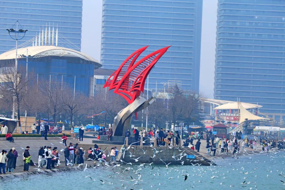 在波澜的海面上,清凉的海风裹挟着浪花翻涌。成群的海鸥从西伯利亚出发飞抵这里,它们在半空中盘旋、飞舞、鸣叫。岸边,举着面包屑的游客踮起脚尖,快门声与欢笑声此起彼伏,好不惬意。