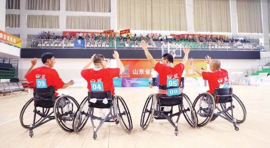 9月18日,在残运会轮椅篮球赛上,日照二队于开赛前精彩亮相,顿时掌声雷动,为日照队的助威呐喊声震耳欲聋久不停歇。一名日照二队的参赛选手表示,作为东道主,无论赛果如何,首先气势得到位。(日照报业全媒体记者 范成思 报道)