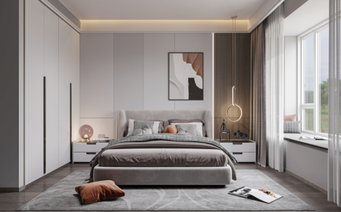 主卧套房设计,宽敞明亮,配备独立卫生间、衣帽间及飘窗,个性化设计、空间大、使用方便,尊重主人私密生活的同时,收藏男女主人阅遍世界的美丽,卸下白天的疲惫,在此休憩身心,从容自得融于点滴日常。