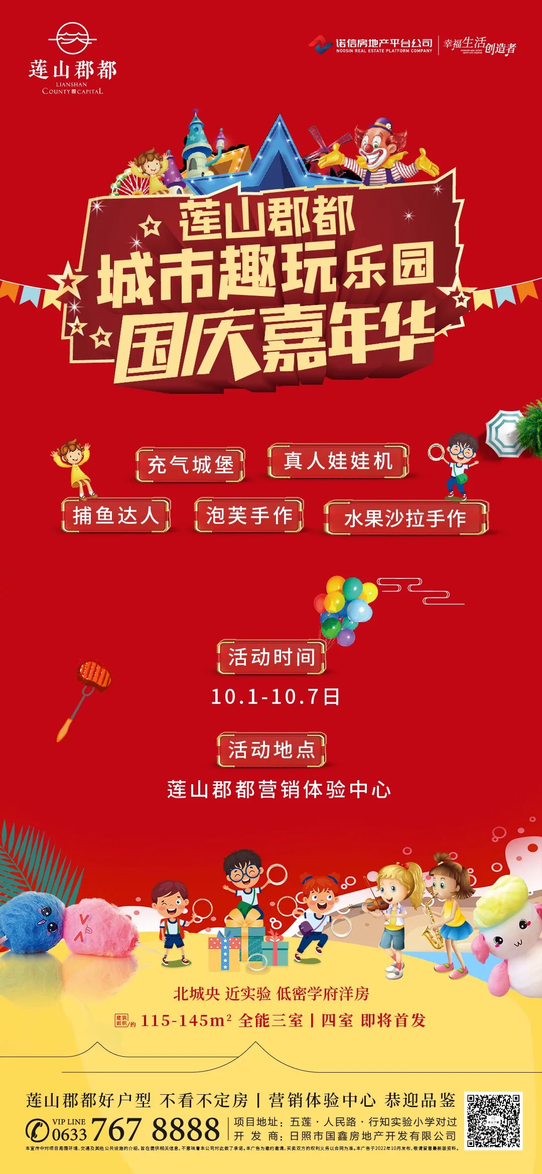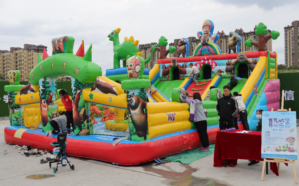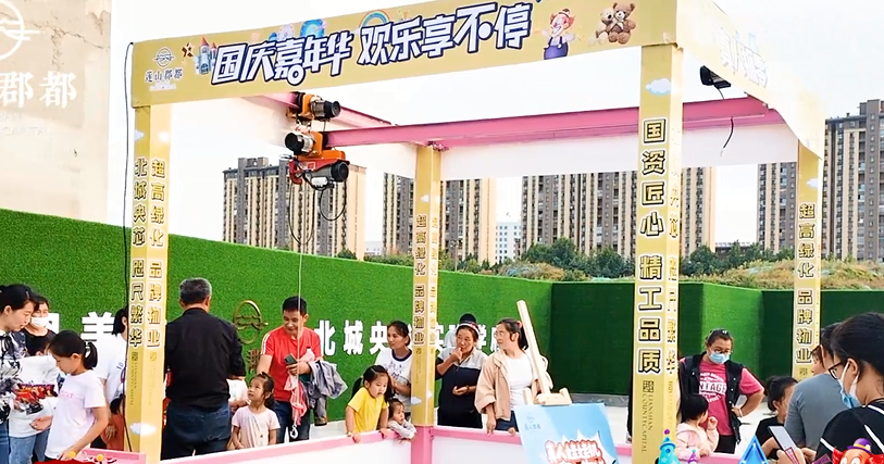 国庆期间,莲山郡都成了小朋友们的游乐园,小朋友在家长的带领下,来到莲山郡都营销体验中心,一起在充气城堡上玩滑梯,一起体验自上而下滑落的快乐。