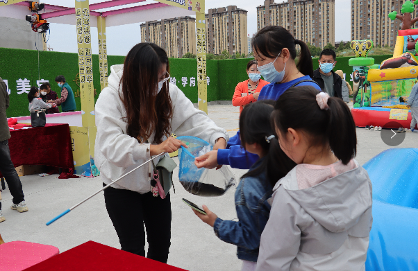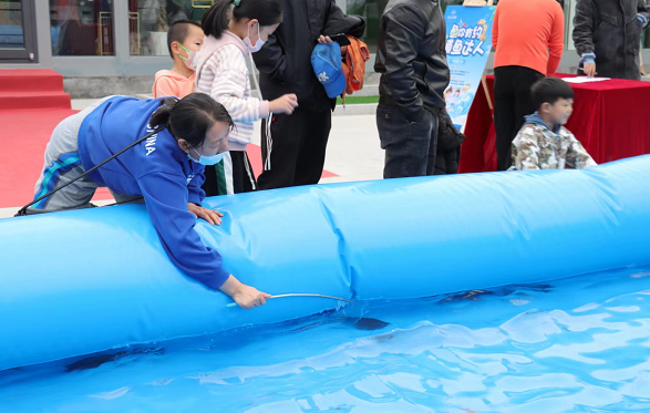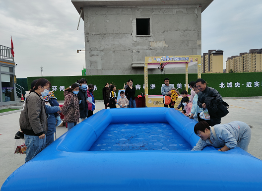 捕鱼达人活动吸引孩子们的注意,小朋友纷纷拿起鱼网,加入捕鱼活动中,在家长的协助下,体验着捕鱼的快乐!