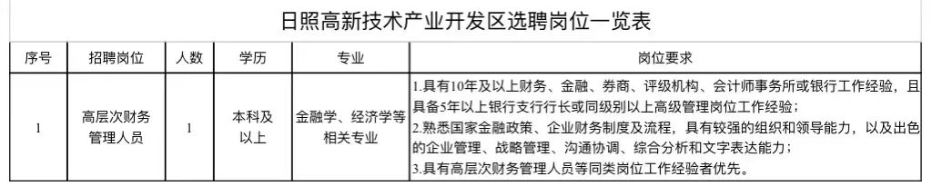 为持续优化国有资本布局、打造区域经济发展龙头载体,作为AA级综合性国有企业,日照高新发展集团有限公司不断加强国有资产运作,提高企业市场竞争力,为全市、全区提供优良的投资和生活环境。根据工作需要,现面向社会选聘高层次财务管理人员,现公告如下: