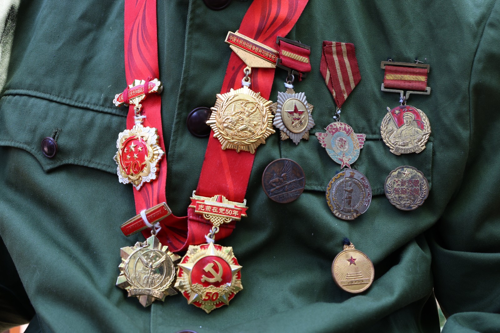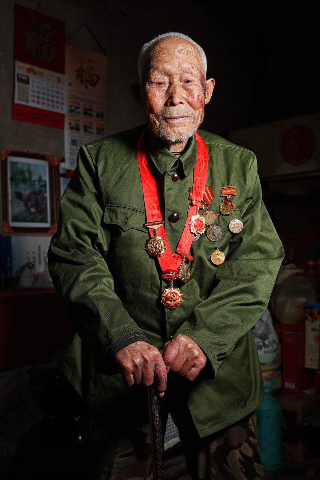沐着夏日的风,老人接成法半眯着眼坐在老槐树下。百岁高龄的背脊已有些佝偻,可胸前那排军功章却在阳光中挺得笔直,像一组沉默的哨兵,守着岁月深处的烽火记忆——