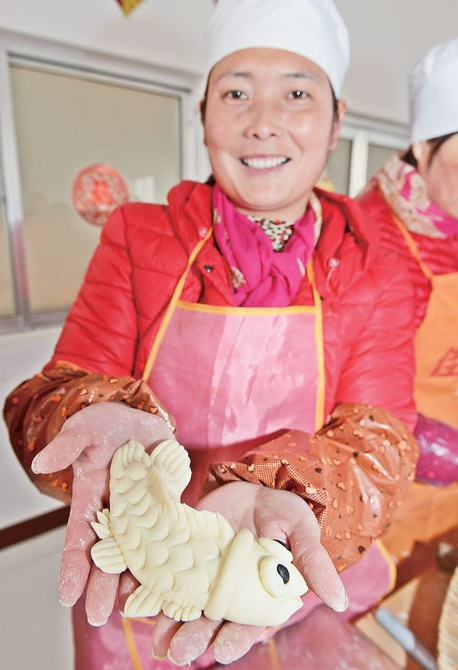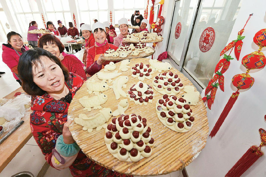 1月30日,莒县浮来山镇田家店子村老年公寓,20多位村民在老年公寓食堂制作花馍。