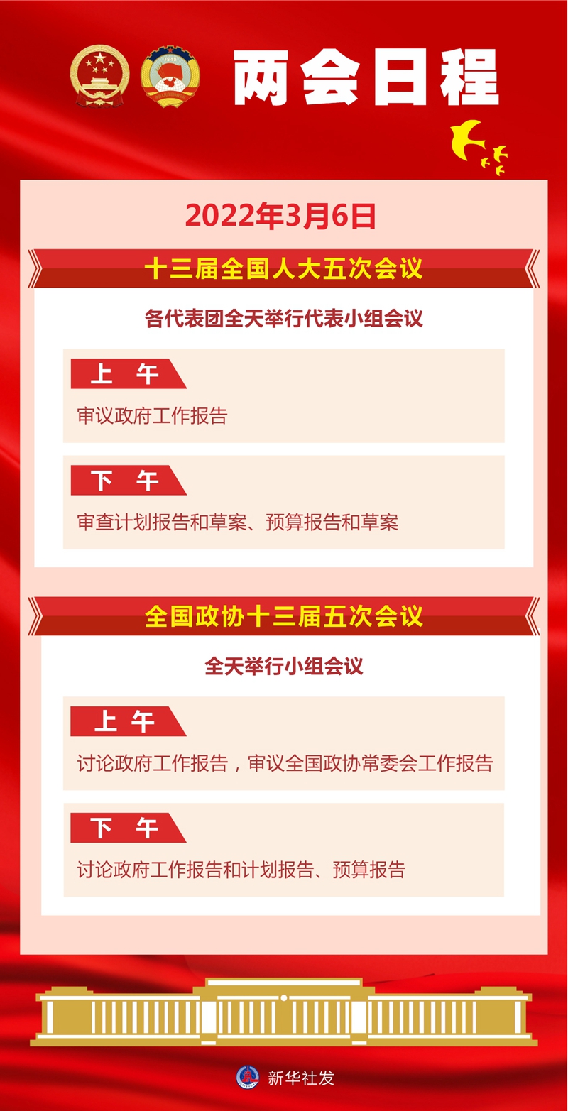新华社北京3月5日电 十三届全国人大五次会议各代表团6日全天举行代表小组会议。上午审议政府工作报告,下午审查计划报告和草案、预算报告和草案。