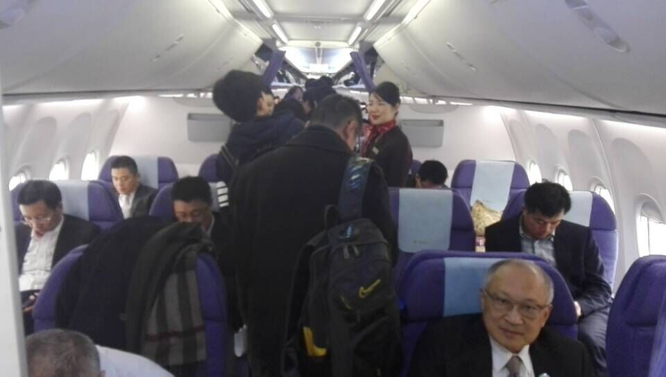 上午9点30分,上海-日照首航乘客陆续登机。飞机上共有5名空中乘务员,3名空姐。