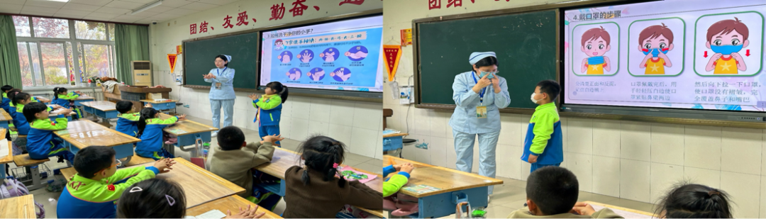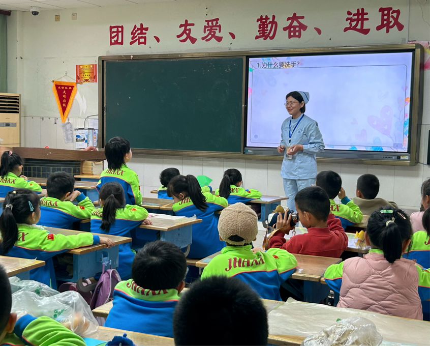 在活跃温馨的课程中,徐护士长通过生动的讲解和与学生的提问互动环节,指导学生掌握规范的洗手方法和口罩佩戴方式,促进学生养成注意个人卫生和环境卫生的良好习惯,争取做到预防为主,健康过冬。