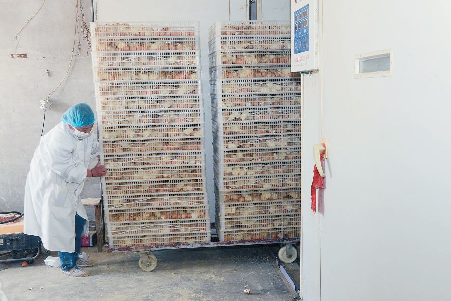 5月12日,在东港区日照街道山庄村兴达种鸡场,记者正好赶上出鸡的场面。这家的女主人申桂花告诉记者,他们家养了1.6万套种鸡,场里有13台箱体式全自动孵化机,每台孵化机每次能装1.9万只鸡蛋,孵化出1.6万只小鸡。自己饲养种鸡,能保证种蛋的质量和出鸡率。