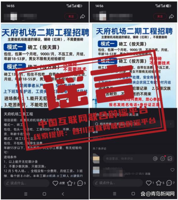 真相:近期,网传“成都天府机场二期工程正在招工”,引发关注。1月15日,成都东部新区公园城市建设局与成都天府国际机场二期扩建工程前期工作办公室联合发布《关于天府国际机场二期工程相关信息的公告》指出:以上招工信息均为虚假内容,请广大群众切勿轻信。(来源:四川互联网举报辟谣平台)
