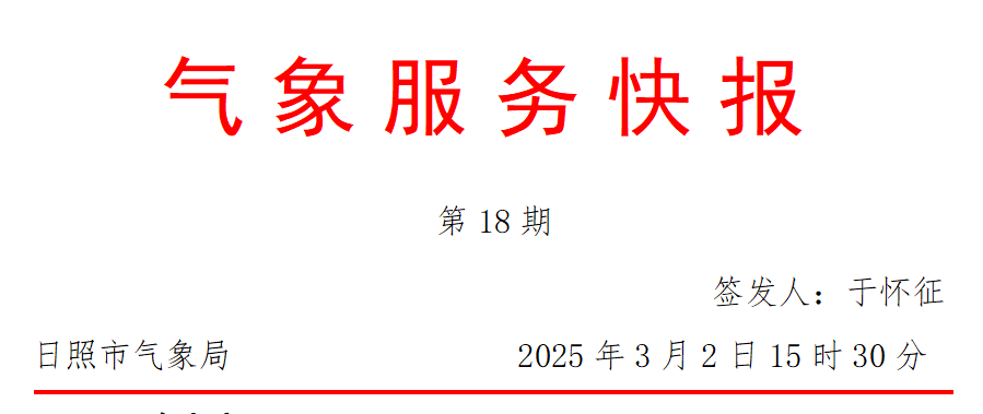 日照市气象台继续发布大风黄色预警和寒潮蓝色预警。今天下午到夜间,阴有中雨,东北风,陆上5~6级、阵风8~9级,沿海及近海海域6~7级、阵风9级,海上7~8级、阵风9~10级,最高气温4℃左右,最低气温沿海1℃,内陆-1℃。