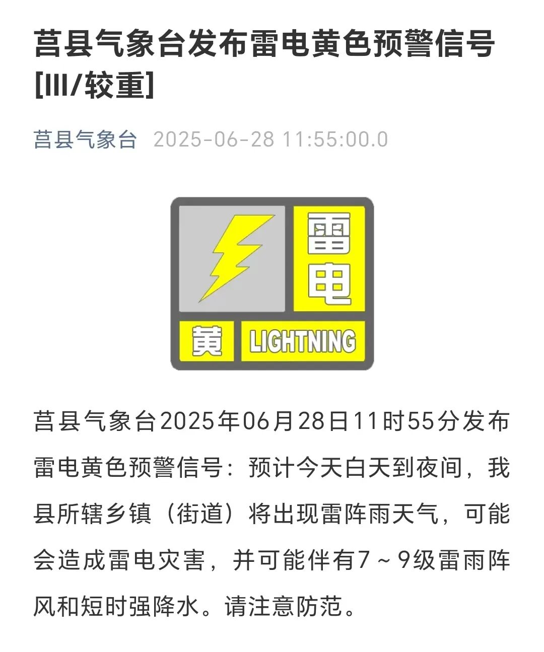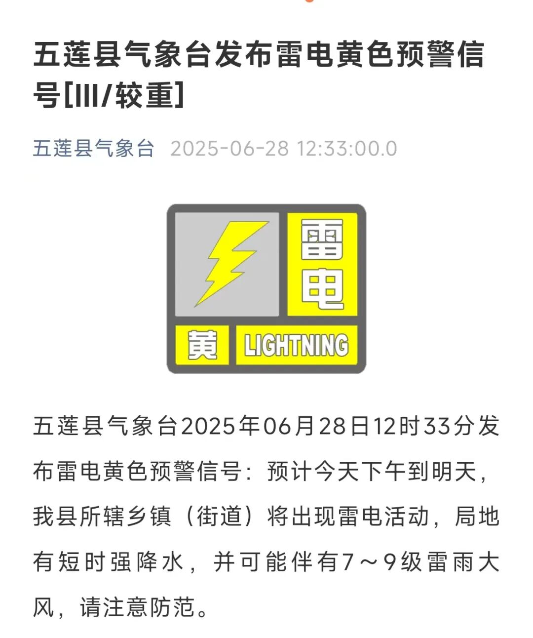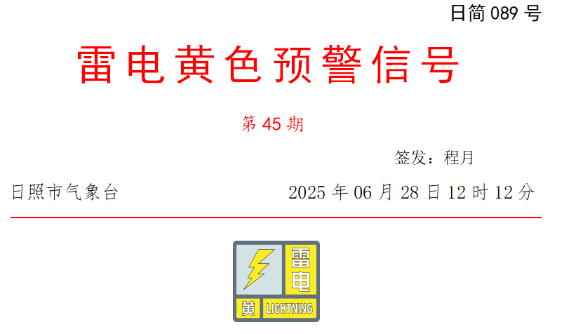 发布东港区、岚山区雷电黄色预警信号