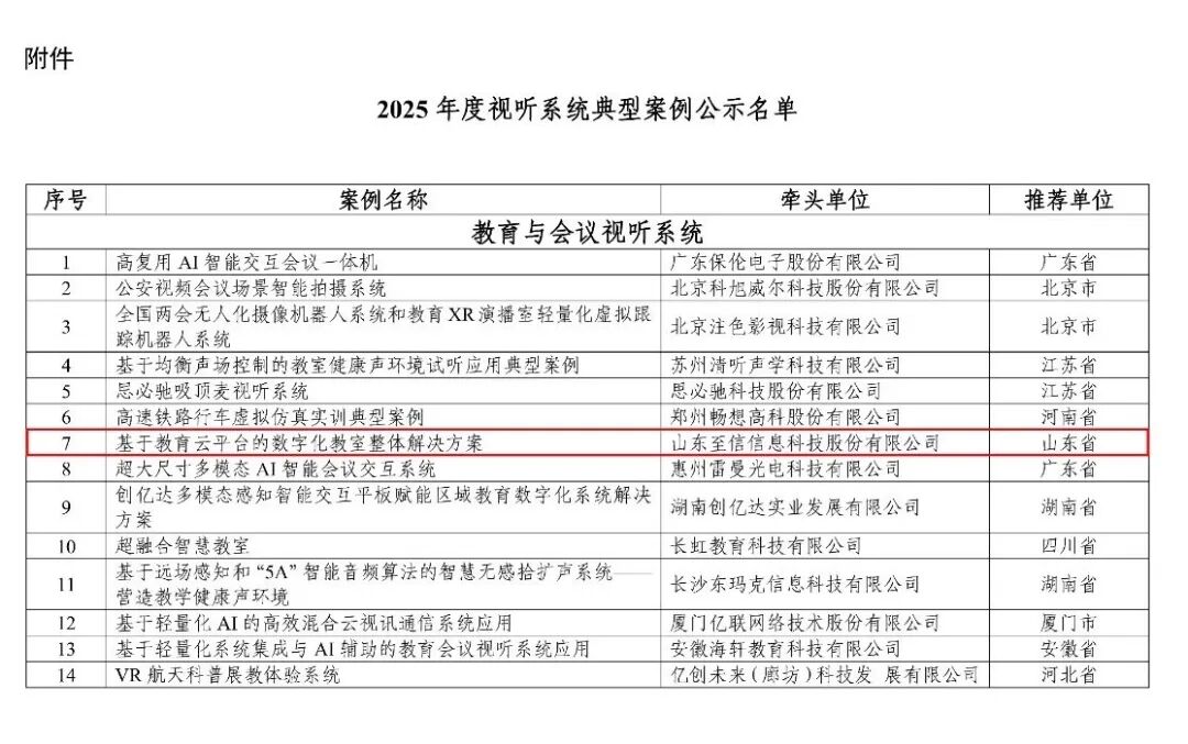近日,工业和信息化部、文化和旅游部、国家广播电视总局等五部委组织开展的2025年度视听系统典型案例征集拟入选名单已公示,全省共有4个案例入选,山东至信信息科技股份有限公司“基于教育云平台的数字化教室整体解决方案”成功入选教育与会议视听系统方向典型案例,是山东省该类别中唯一入选案例。