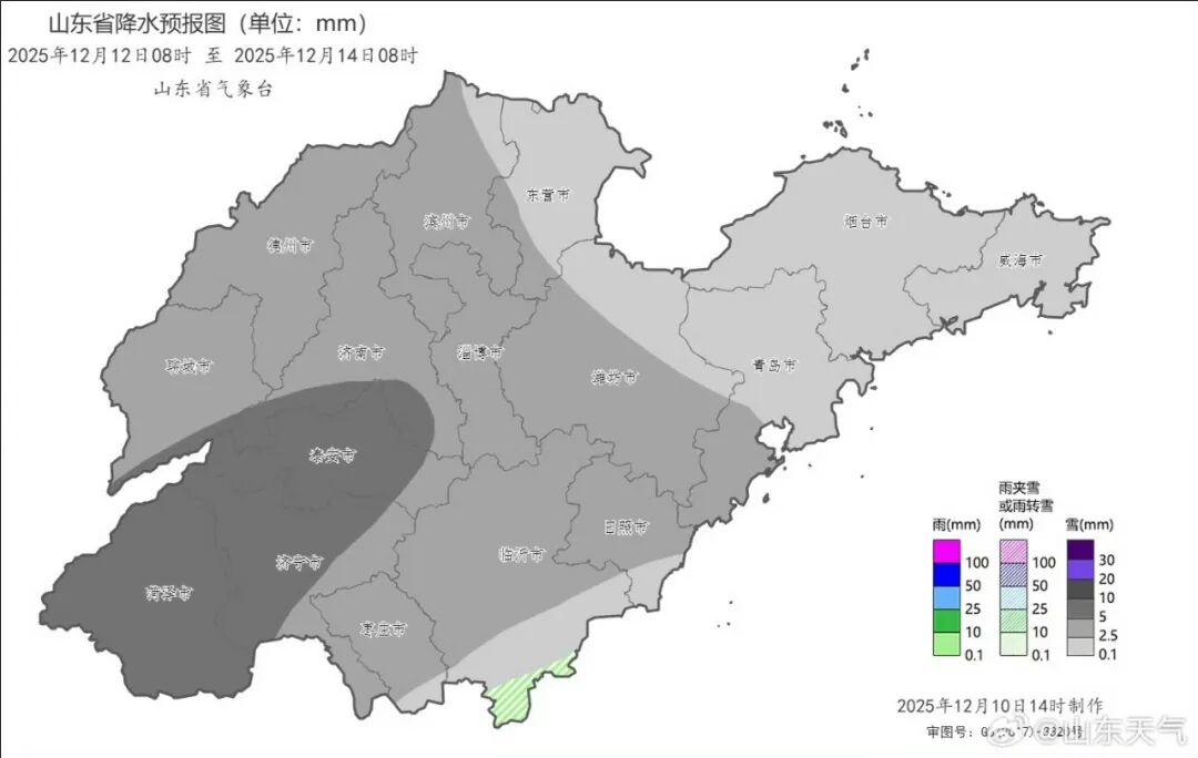 五莲县气象台2025年12月10日15时20分发布寒潮蓝色预警信号:受强冷空气持续影响,预计11~14日我县全部镇街将出现寒潮天气。11日起气温明显下降,过程平均降温幅度8~10℃,部分乡镇最低气温-8℃左右,出现在14日早晨。期间风力较大,北风最大风力4~5级、阵风7级,局部山区阵风可能达8级,其中12日下午到13日上午有雨夹雪转雪天气,请注意防范。