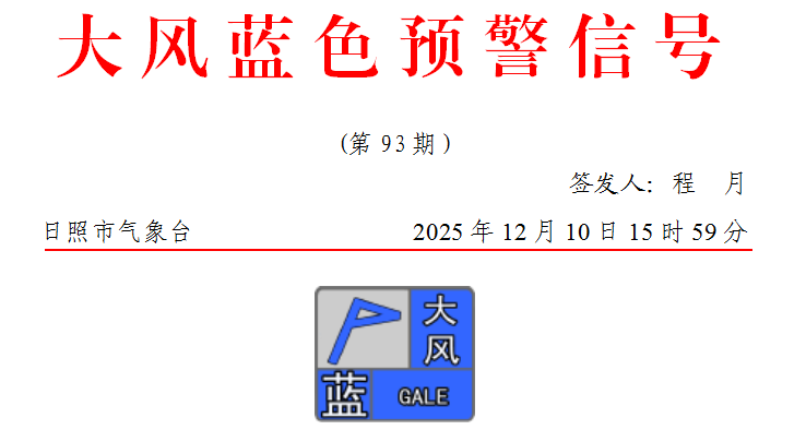 日照市气象台2025年12月10日15时59分发布东港区、岚山区大风蓝色预警信号:受冷空气影响,预计明天清晨到夜间偏北风风力较大,最大风力内陆地区4~5级、阵风7~8级,沿海及近海海域5~6级、阵风8级,海上7级、阵风8~9级。