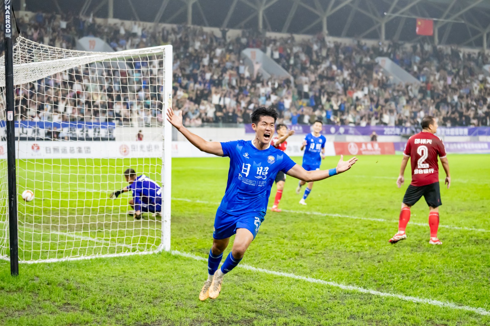 2025山东省齐鲁足球超级联赛日照主场赛事,日照队进球瞬间 刘晶/摄