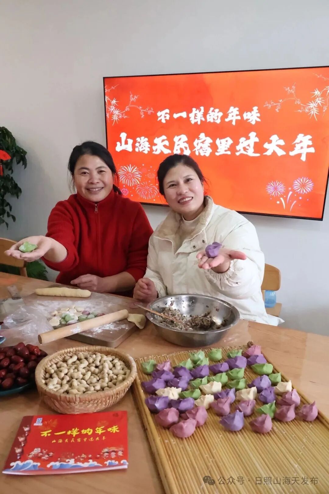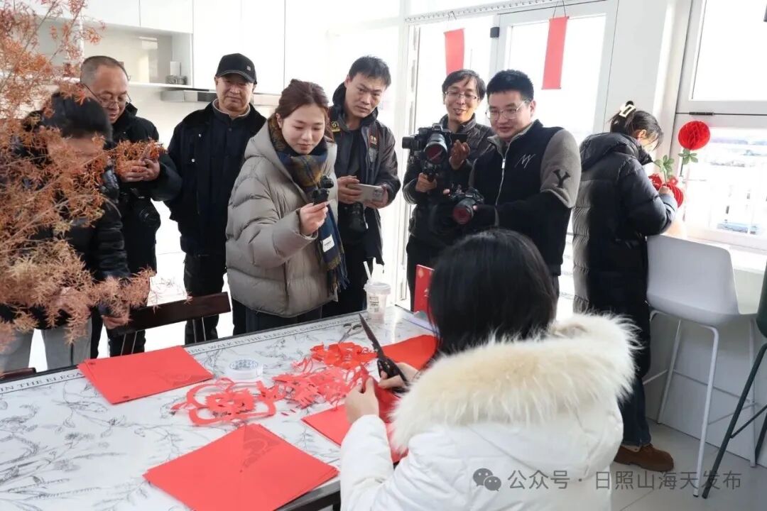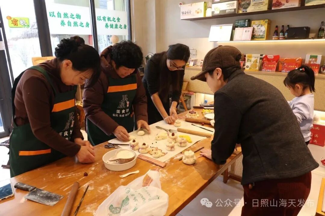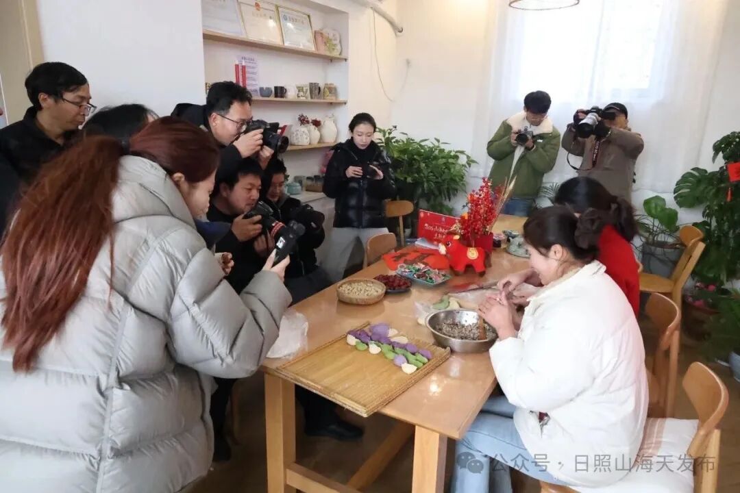 走进乔家墩子村里屋民宿,民宿主们正围坐在一起忙碌不停,巧手翻飞间,各式花馍便次第成型:层叠的枣山、精巧的花式馍团,每一款造型皆凝满巧思,藏着岁岁平安、事事顺遂的美好吉祥寓意。面朝大海的卟噜·BLUE花园民宿里,则是红纸轻扬、剪刀如舞,众人低头细心裁刻,一张张窗花渐露吉祥模样,完成后再贴在观海的窗户上——窗外碧波无垠,窗内红影摇曳,宛然一幅生动温馨的新年画卷。走进张家台村六月小筑民宿,又是另一番热闹景象,菠菜的翠绿、胡萝卜的明橙、紫薯的淡紫……各色面团裹上鲜香满溢的肉馅,化作一盘盘缤纷的彩色水饺,笑语与锅灶声交织,浓浓的年味,就这样被包进了每一道褶子里。