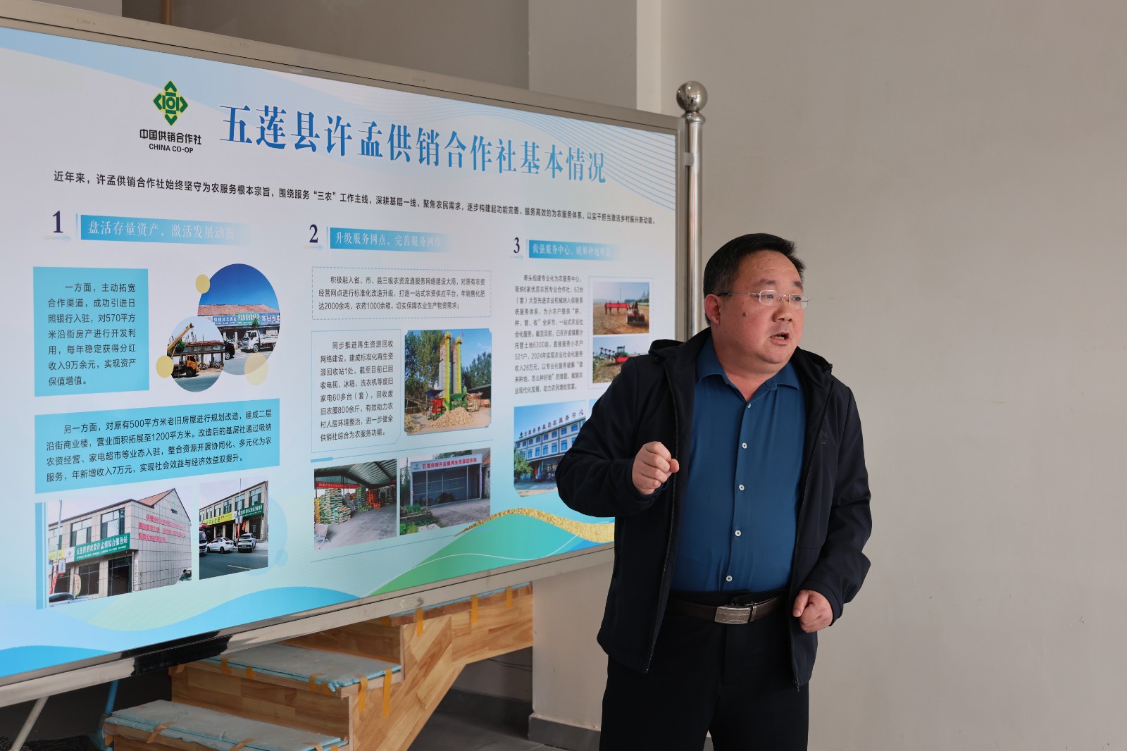 一是盘活存量资产,激活发展动能。一方面,主动拓宽合作渠道,成功引进日照银行入驻,对 570 平方米沿街房产进行开发利用,每年稳定获得分红收入 9 万余元,实现资产保值增值。另一方面,对原有 500 平方米老旧房屋进行规划改造,建成二层沿街商业楼,营业面积拓展至 1200 平方米。改造后的基层社通过吸纳农资经营、家电超市等业态入驻,整合资源开展协同化、多元化为农服务,年新增收入 7 万元,实现社会效益与经济效益双提升。