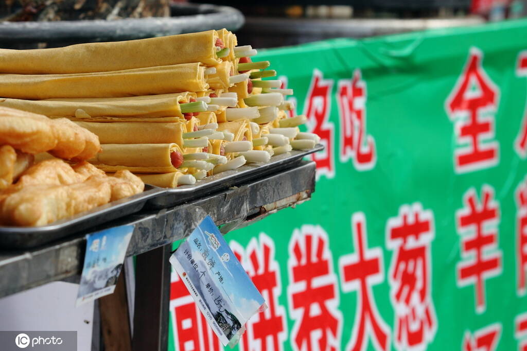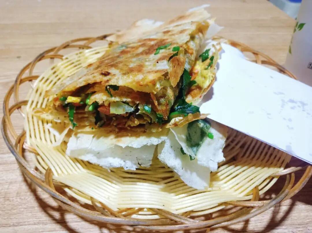 在新烙出来的煎饼上摊上食用油、鸡蛋、火腿肠和各种时令青菜,加热熟透,卷上几下,再分成几块,用洁净的纸一包,捧在手里,香气扑鼻,让人胃口大开。菜煎饼营养丰富,吃起来方便快捷,既可当早点,也可作正餐。