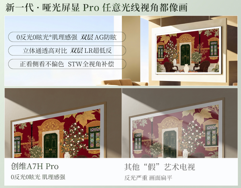 专业的外观设计只是“开胃菜”,创维A7H系列更在屏幕技术上持续发力,将上代产品本就颇受好评的“极黑广角类纸屏”升级为“画境屏”。新一代“哑光屏显Pro”技术拥有双层LR抗反射涂层和AG25防眩光层,带来“0反光0眩光”的出色表现;再配合STW光学补偿层,无论正看侧看都不会偏色。这块屏幕在任意光线和视角下观看,都宛如巨幅画作般赏心悦目。