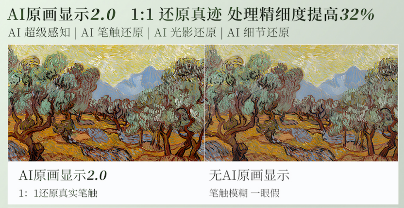 此外,创维A7H系列升级搭载了“AI原画显示2.0”技术,在识别到画作时,不仅能从笔触、光影、细节三个方面增强显示,还能通过感知环境光线的细微变化,进一步调教显示效果,使观感更加通透和立体,处理精细度较上一代提升32%,1:1还原画作真迹。