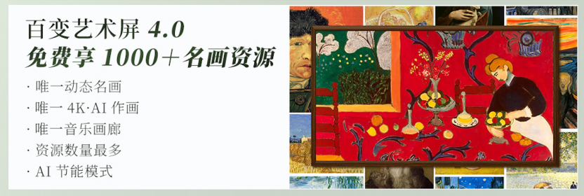 顶尖的屏幕素质,自然要用名画来展现,让电视在不用时成为客厅的“百变画廊”。创维A7H系列内置“百变艺术屏4.0”,终身免费提供梵高、莫奈等海量知名艺术家的超1000+精品画作,不同流派不同感受,每天换一幅,天天好心情。值得一提的是,“百变艺术屏4.0”还支持动态名画显示,用户也可以一键连接音乐,秒变音乐画廊,满足生活中的小情趣。功能如此丰富的“百变艺术屏4.0”自带AI节能模式,三天只用1度电,大家不必担心待机耗电的问题。
