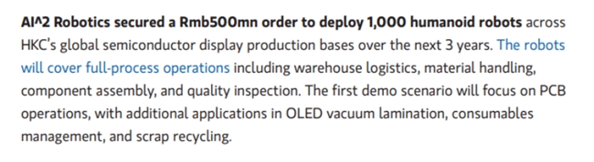 报告中特别提到的,是智平方与全球第三大面板厂惠科(HKC) 的合作——一笔 5 亿元人民币、超千台机器人的订单。