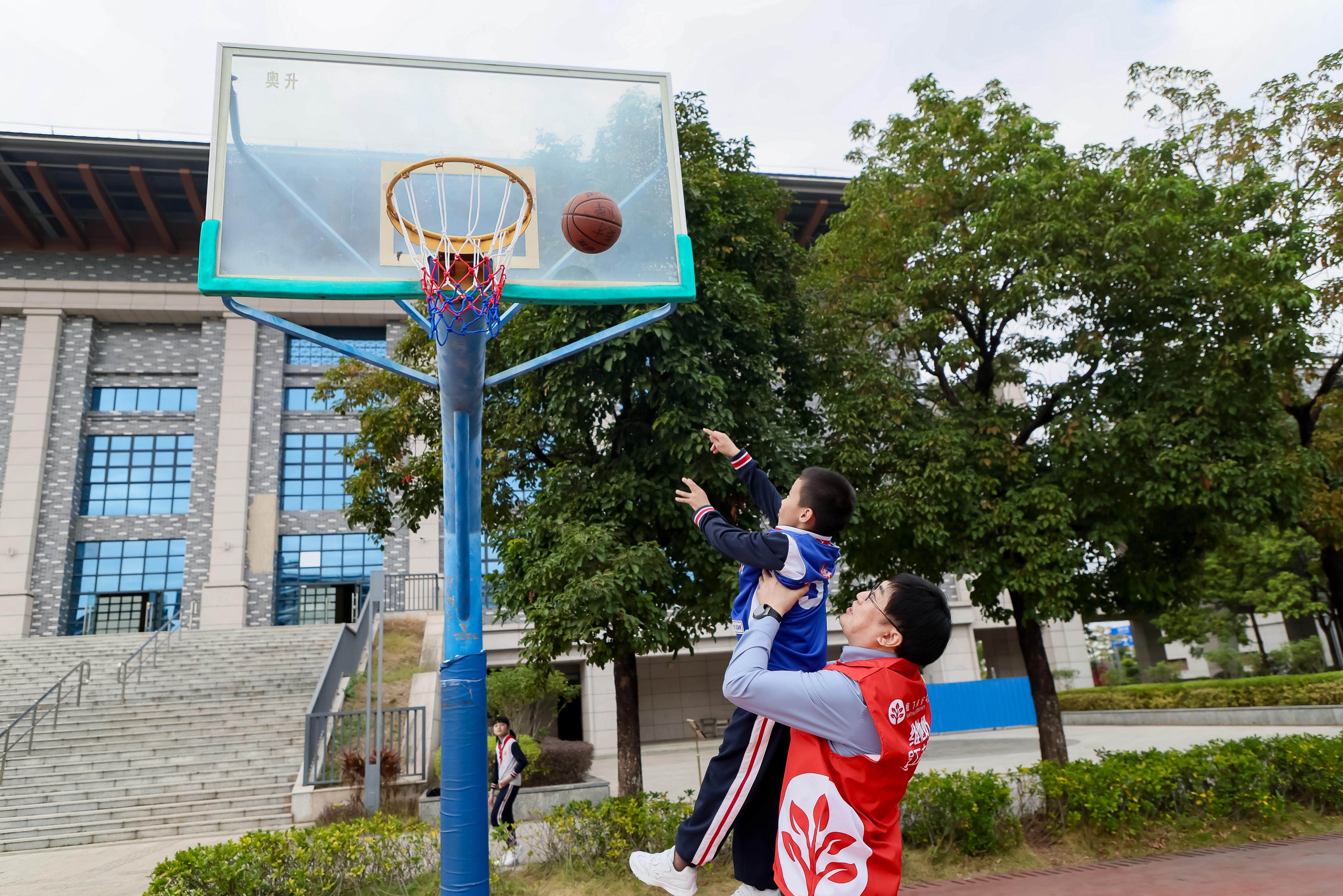 维他奶(佛山)有限公司总经理王军和佛山市南海区狮山英才学校学生们一起打篮球