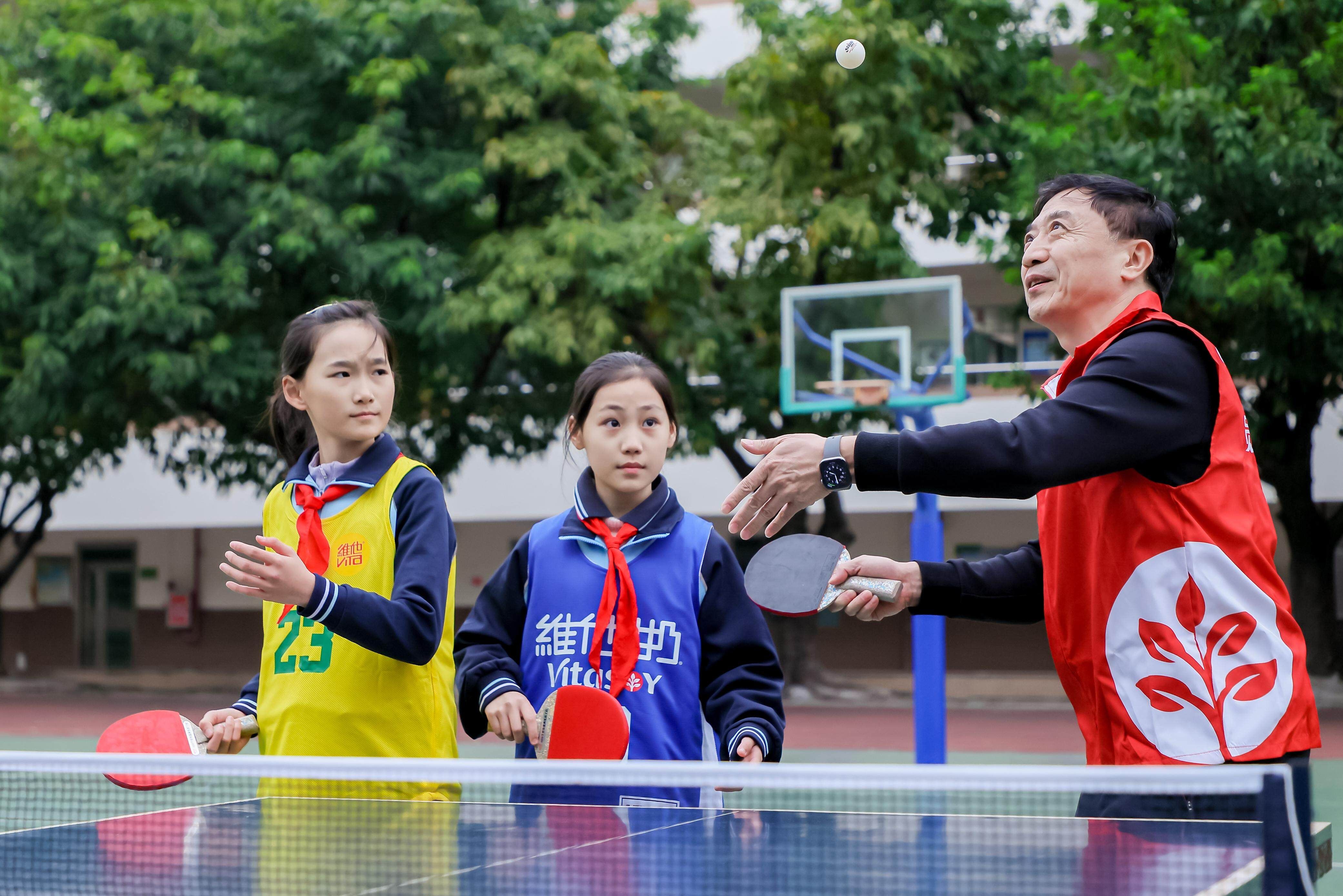维他奶(东莞)有限公司总经理刘勇和东莞市常平镇第一小学孩子们一起打乒乓球