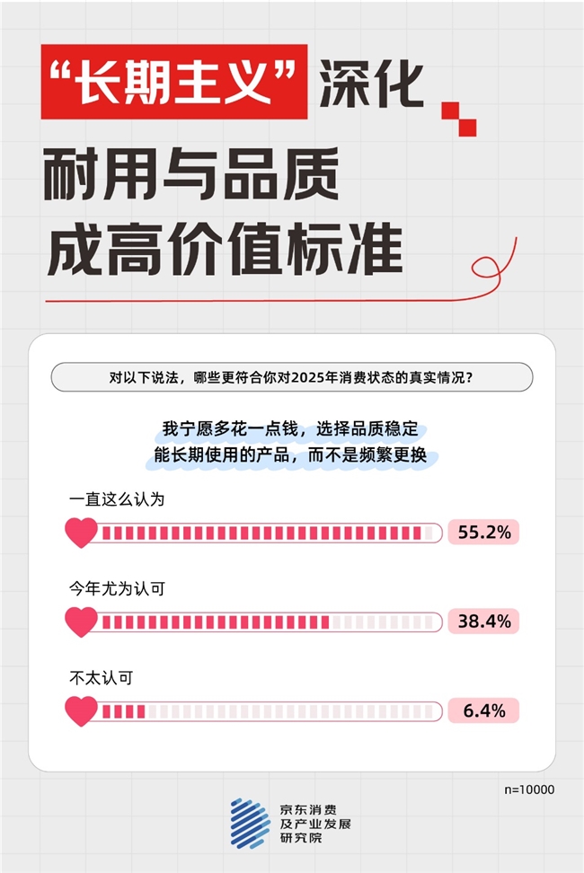 2025年,“少折腾、用得久、长期收益高”成为更多人的消费准则。10000名消费者中,55.2% 宁愿预算上探也倾向买“能长期用的”,50.2% 更愿意把钱花在“对未来有持续价值的事情上”;45.7%人将“购买耐用高品质产品”视为今年最重要的态度变化。消费数据显示,高端家电(健康风空调同比增长超200%)、抗衰护肤品(抗衰相关眼霜、精华、面膜同比均成交额均超10倍)、优质羽绒服等品类热销,十年质保、以旧换新服务受青睐。健康管理上,镁、维生素D等长期营养补充品成交额均大幅增长。频繁更换被认为是时间浪费,宁可一次性投入购买更可靠更长久使用的产品。
