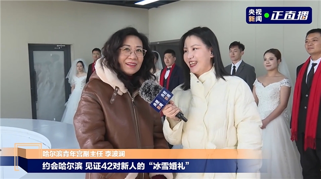 婚礼盛典期间,哈尔滨青年宫副主任李波澜与5对来自天南海北的新人代表受邀走进央视总台冰雪演播室,围绕“纯洁冰雪 唯美爱情”的主题向全国观众分享这场独特婚礼的心动瞬间。