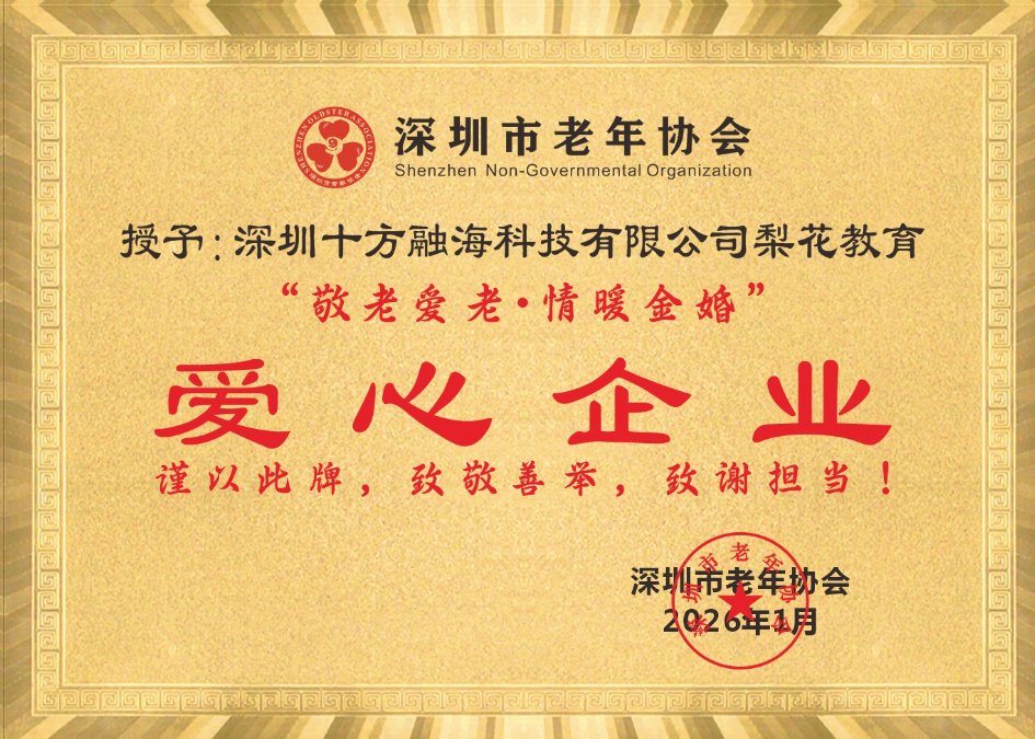 2026年1月7日,由深圳市老龄工作委员会办公室指导、深圳市老年协会举办的2025—2026年会暨首届金婚美好家庭庆典,在光明区润桦全福楼海鲜酒家温情举行。作为银发经济领域的文化养老标杆企业,梨花教育受邀出席盛会,并凭借在践行社会责任、AI+文化+适老化方面的持续贡献,被授予“敬老爱老・情暖金婚”爱心企业称号。
