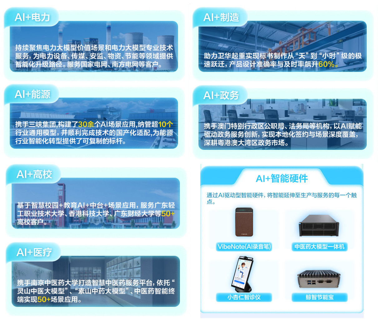 AI 技术跨行业渗透,成为增长新引擎。升级推出电力大模型2.0,携手国家电网、南方电网赋能电力行业服务;携手三峡集团构建30余个能源 AI场景应用;助力卫华起重打造AI智能制造平台,实现标书制作效率跃升、产品设计准确率提升60%;深耕AI+政务、高校,服务50 +高校及澳门多政府机构,AI中医药大模型、中医药智能终端实现50+场景应用,商业价值转化成效显著。