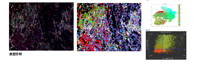 APTime 的功能体系覆盖全维度研究需求:多重免疫荧光定量分析环节,AI 模型可自动完成细胞分割与阳性判定,基于染色强度将阳性细胞分为 1+、2+、3 + 三个等级,输出细胞大小、直径、周长等形态数据,以及各通道染色强度、标志物阳性率、H-score 值等量化结果;高级分析层面,共表达分析可通过多靶点信号叠加,精准识别细胞亚型(如 CD3+CD8 + 的细胞毒性 T 细胞);表型分析则通过 t-SNE 图、热图等可视化形式,呈现免疫微环境中的细胞多样性,助力发现新的细胞表型与潜在治疗靶点;类流式分析以直方图、散点图形式直观展示细胞表型分布,支持细分细胞群的进一步筛选,分析逻辑与流式细胞仪软件一致,降低科研人员学习成本。