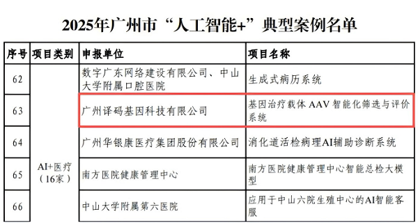 近日,广州市工业和信息化局指导、广州人工智能算力应用及产业发展联盟组织的2025年广州市“人工智能+”典型案例评选结果正式揭晓。赛业生物旗下子公司广州译码基因生物科技有限公司(简称“译码基因”)申报的“基因治疗载体AAV智能化筛选与评价系统”凭借突出的技术创新与产业价值,成功入选AI+医疗领域典型案例,彰显了企业在人工智能与基因治疗交叉领域的领先实力。