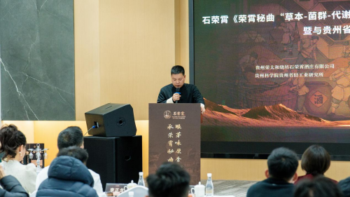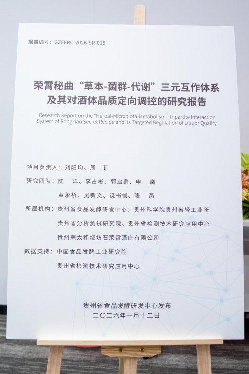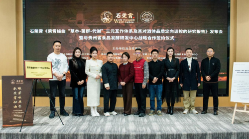 2026年1月12日下午,石荣霄《荣霄秘曲“草本-菌群-代谢”三元互作体系及其对酒体品质定向调控的研究报告》发布会暨战略合作签约仪式”在贵阳隆重举行,共同揭牌成立“荣霄秘曲传承与创新研究中心”。