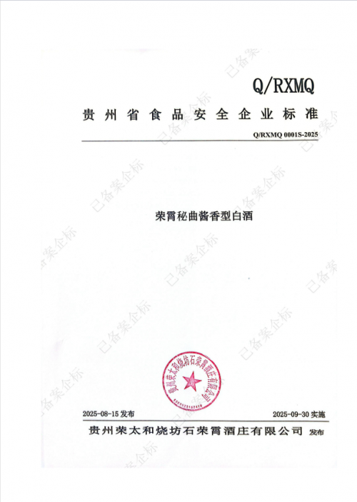 此次科研发布与机构共建,是石荣霄系统化构建品牌核心竞争力的战略深化。此前,酒厂已通过《贵州省食品安全企业标准〈荣霄秘曲酱香型白酒〉》审核并报备,备案流水号:5201058S-2025,是行业内少有拥有独立企业标准的酒厂。