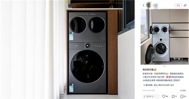 同时,海信热泵洗烘一体机棉花糖E8Q还可以在上方叠加小双筒,变成海信全家筒棉花糖E8Q三筒洗衣机(WH130E8Q+WV20G-H、WH130E8Q-1+WV20W),能实现3洗+3烘+3智能投放,既可同洗同烘也能单筒独立工作,彻底告别所有混洗将就,满足大人、孩子、内衣、深浅色的精细分区需求。有用户赞叹:“家里人多,每天要洗衣服的量比较大,所以这次主要选择海信三筒洗衣机,对比了市面上主流的几款机型,始终选择了海信棉花糖,直驱电机运行噪音小,分区洗衣干净卫生,很值得推荐!”