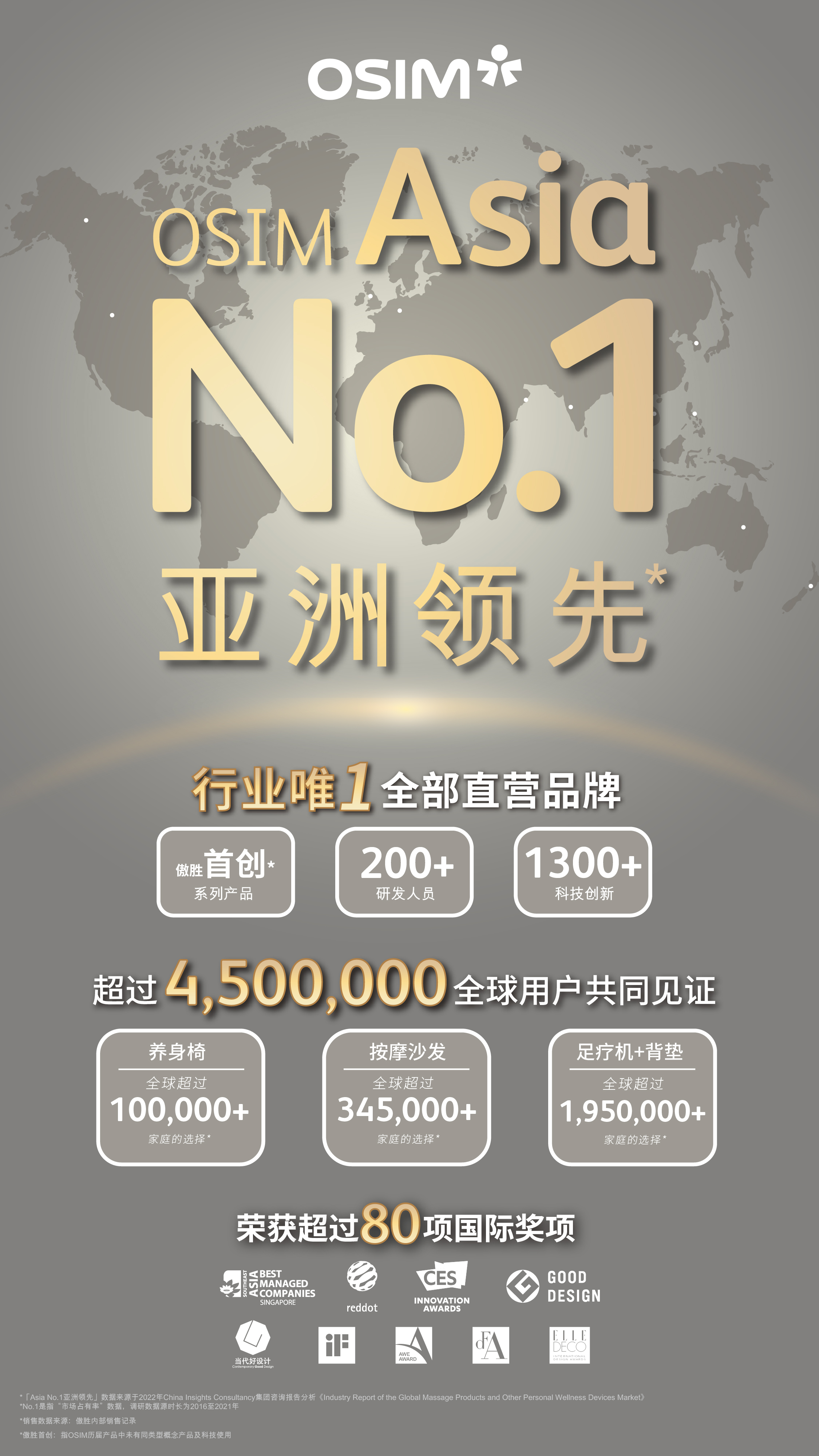 来自新加坡的OSIM傲胜,是Asia No.1*的亚洲领先高端按摩椅品牌。多年来,OSIM傲胜始终以提高顾客的身心健康为品牌使命,并保持在研究、开发和创新的发展前沿。其推出的养身科技按摩产品,为众多家庭带来了舒适高质的生活,OSIM傲胜uLove 2 (中文名:4手天王)按摩椅纪念版就是其中的代表作之一。