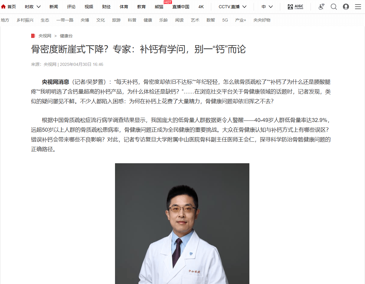 在央视采访中,复旦大学附属中山医院骨科副主任医师王会仁也指出,补钙不等于补骨,单纯补钙无法解决因骨胶原流失导致的骨结构松散问题。若只补钙而忽略骨胶原,难以实现骨关节有效养护。
